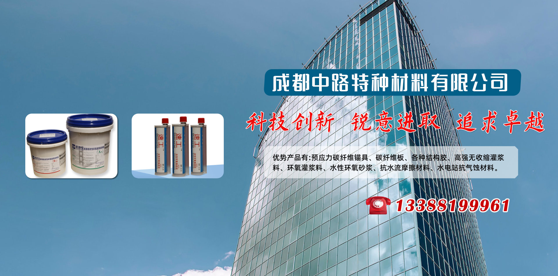 成都中路特種材料有限公司借助清華大學高分子材料學科、晨光化工研究院、西南交通大學、四川交通職業技術學院科研技術平臺成為一家集新材料研發、銷售、技術服務和施工于一體的專業服務公司,優勢產品有:預應力碳纖維錨具、碳纖維板、各種結構膠、高強無收縮灌漿料、環氧灌漿料、水性環氧砂漿、抗水流摩擦材料、水電站抗氣蝕材料和研發各種特殊用途膠黏劑產品地處西南腹地成都,業務覆蓋四川各大中小城市、重慶、云南、昆明、新疆、西藏等區域。產品涵蓋各種加固施工材料、施工設備及施工配件,品牌有威士邦等aa進口品牌,同時批發銷售國產高、中、低端品牌,為客戶提供全面參考。 成都中路特種材料有限公司為您提供加固行業的一站式服務! 如果您面對建筑物加固,不知如何下手,我們將針對您的項目情況,提供全面的技術指導咨詢,甚至為您量身定做加固方案;如果您面對項目要求,不知如何購買加固材料,我們將根據您的需要,提供多種參考,從進口品牌、國內知名品牌到低端產品,一應俱全; 如果你萬事俱備,不知何處尋找施工人員,我們可以為您提供具有多年加固經驗的專業隊伍;中路特種材料致力于為客戶提供全方位的建筑物加固解決方案。 成都中路特種材料有限公司是一座橋,一座連接廠家與用戶的橋,以質量求生存,以信譽圖發展,成都中路特種材料有限公司期望用真摯的服務筑起一座客戶信任之橋。   科技創新 銳意進取 追求卓越!        熱忱歡迎業內專業人士加盟合作!